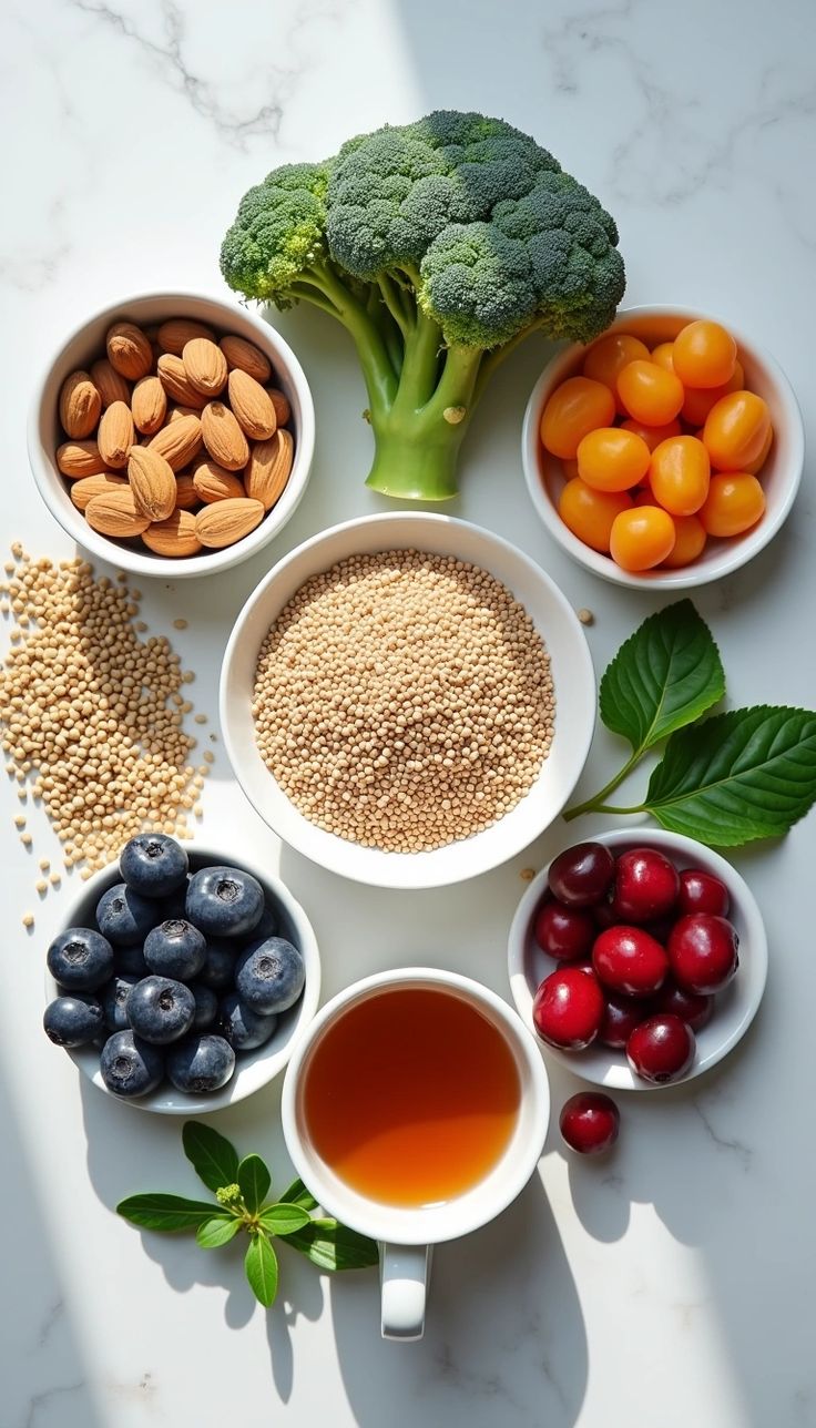 Whole grains, legumes, eggs, nuts, leafy greens, and pumpkin seeds. A combination of protein, complex carbohydrates, and healthy fats helps keep your energy levels steady.